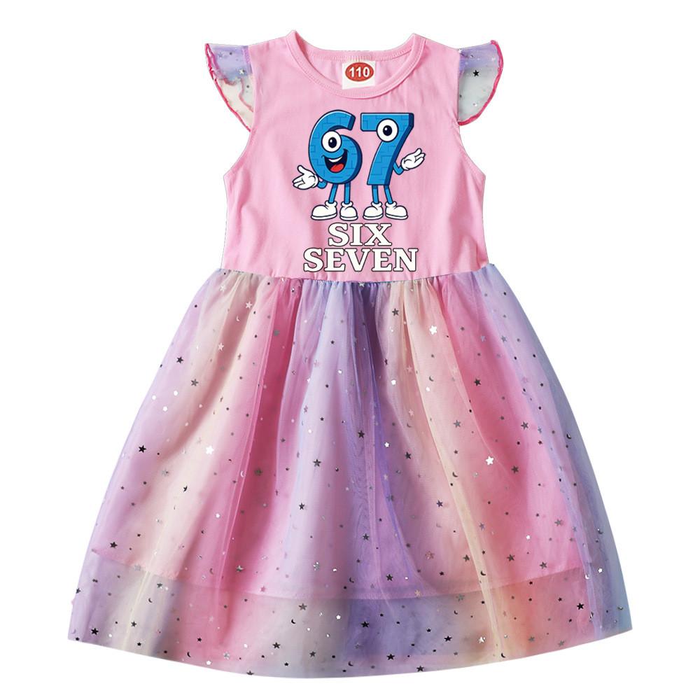 9194 Детское Платье для Девочек Steal a Brainrot 67 Шесть Семь Принт Волан Короткий Рукав Пайетки Повседневное Радужное Платье