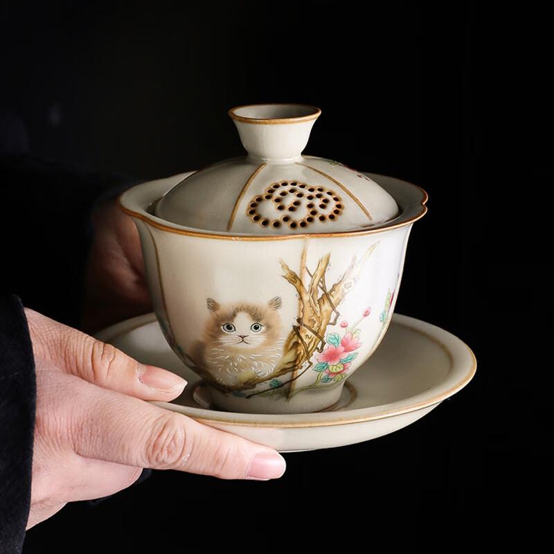 МодельБежевый гайвань печи Жу - Красный цветок и кошка (150 мл)