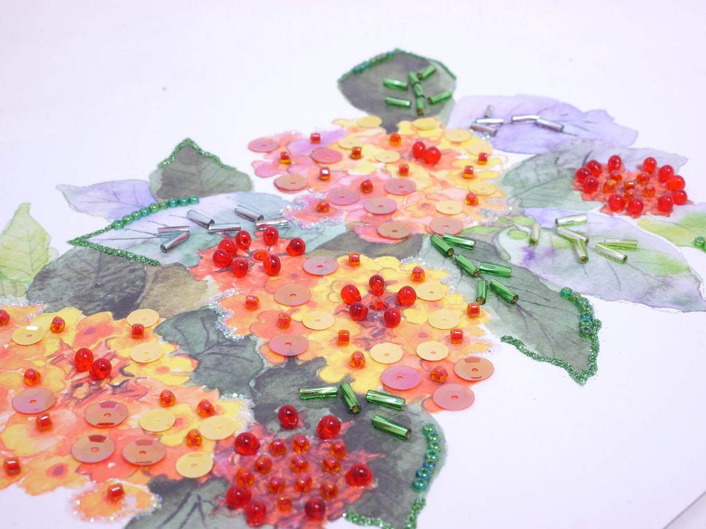 Декор из бусин — это новый вид рукоделия, в котором бусины, пайетки и другие детали крепятся к иллюстрации в акварельном стиле.