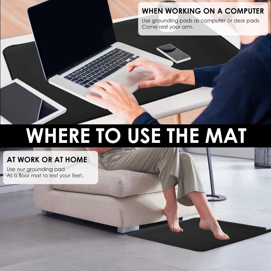 [Премиальный проводящий материал] Наш заземляющий коврик изготовлен из премиальной, мягкой, нескользящей резиновой подложки и покрыт мягкой проводящей веганской кожей из углеродного волокна.. Этот коврик позволяет вам подключаться к неограниченному запасу свободных электронов Земли в помещении через систему электрического заземления вашего дома, что особенно полезно в зимние месяцы, когда вы не можете ходить босиком на улице.