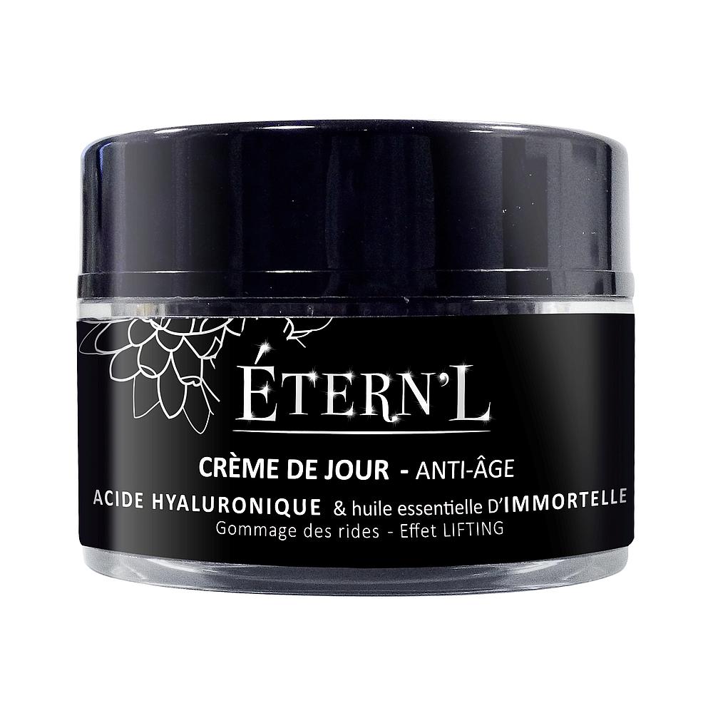 - Discovered in 1934, hyaluronic acid is renowned for its ability to regulate epidermal cell proliferation and retain skin moisture. It acts not only as a "biological glue", participating in the healing and regeneration processes, but also as a signaling element regulating cellular behavior. The human body contains around 15 g of hyaluronic acid, 5 g of which is renewed every day. However, with age and under the influence of external factors, this rate of renewal diminishes, necessitating an additional supply.- Immortelle essential oil has a unique ability not to fade, even after harvesting. It is recognized for its powerful anti-inflammatory, anticoagulant and regenerative properties, promoting microcirculation and tissue strengthening.Regular use of ETERN'L Anti-Aging Day Cream produces a pronounced lifting effect on facial skin: wrinkles are exfoliated by 46% to 96%, their depth reduced by 12.5% to 52%, their surface reduced by 22.5% to 58%, and the lifting effect increased by 22% to 64%. This cream with hyaluronic acid and immortelle oil is an effective remedy for complete rejuvenation and smoothing of facial skin.