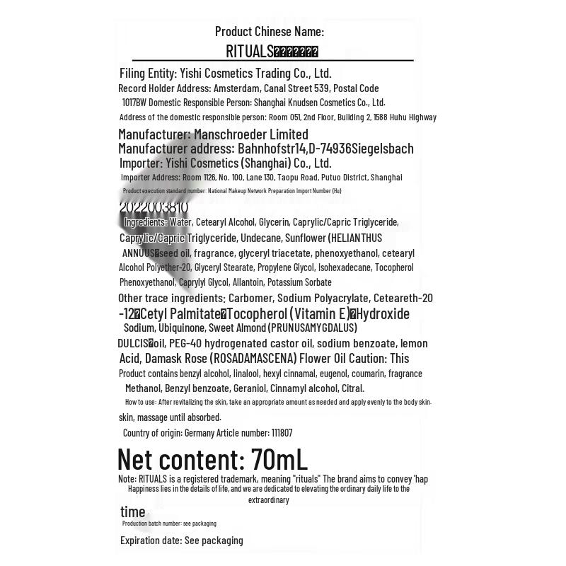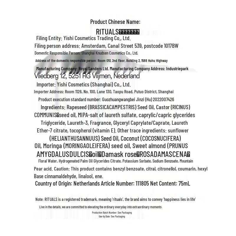 Product (registration/recordation) name: RITUALS The Ritual of Jing Foaming Shower Gel, RITUALS The Ritual of Jing Body Oil, RITUALS The Ritual of Jing Body Cream, RITUALS The Ritual of Jing Bath Oil