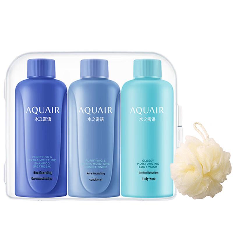 The AQUAIR Purifying & Nourishing Oil Control Travel Set is designed for on-the-go hair and body care. This comprehensive kit includes an oil-control shampoo, a nourishing conditioner, a plumping and moisturizing shower gel, and a bath ball. Each product comes in a convenient 50ml size, offering moisturizing, repairing, and nourishing benefits for a refreshing experience.