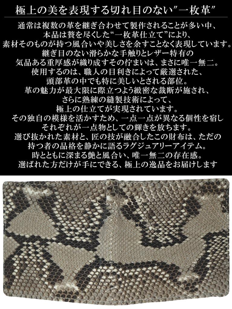 [The finest quality, crafted with Japanese craftsmanship using a single piece of leather and a single piece of unmatched finish] This Nishiki Hebi Musou Long Wallet is the ultimate snakeskin bifold wallet, combining luxurious unmatched finish and a single piece of leather. Its unique manufacturing process, distinct from standard snakeskin wallets, maximizes the beauty, luxury, and durability of the snakeskin. Each wallet is meticulously crafted in Japan by skilled artisans. While making the most of the natural texture of the snakeskin, every detail is meticulously crafted with Japanese craftsmanship. Designed for long-lasting use and durability, it's also ideal for everyday use. This is the ultimate exotic leather wallet, perfect for those seeking authenticity.