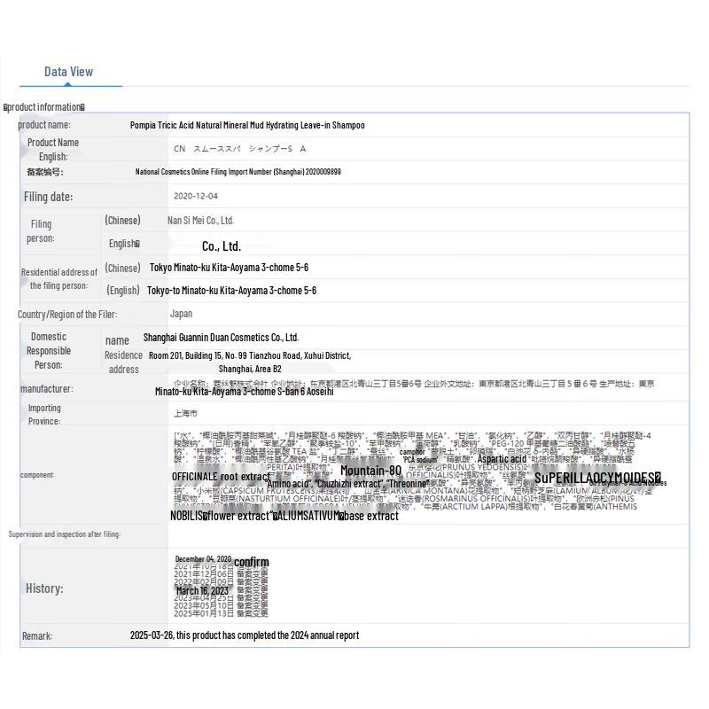 Product (registration/recordation) name: Pompai Amino Acid Natural Mineral Mud Hydrating Long-Lasting Fragrance Shampoo + Conditioner