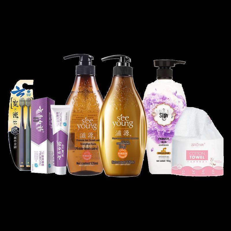 This Ziyuan Daily Essentials & Hair Care Set provides comprehensive personal care, perfect for normal hair types and neutral scalps. It includes a 535ml nourishing shampoo, conditioner, body wash, toothbrush/toothpaste, and a face towel, offering a complete regimen for daily hygiene and hair nourishment.