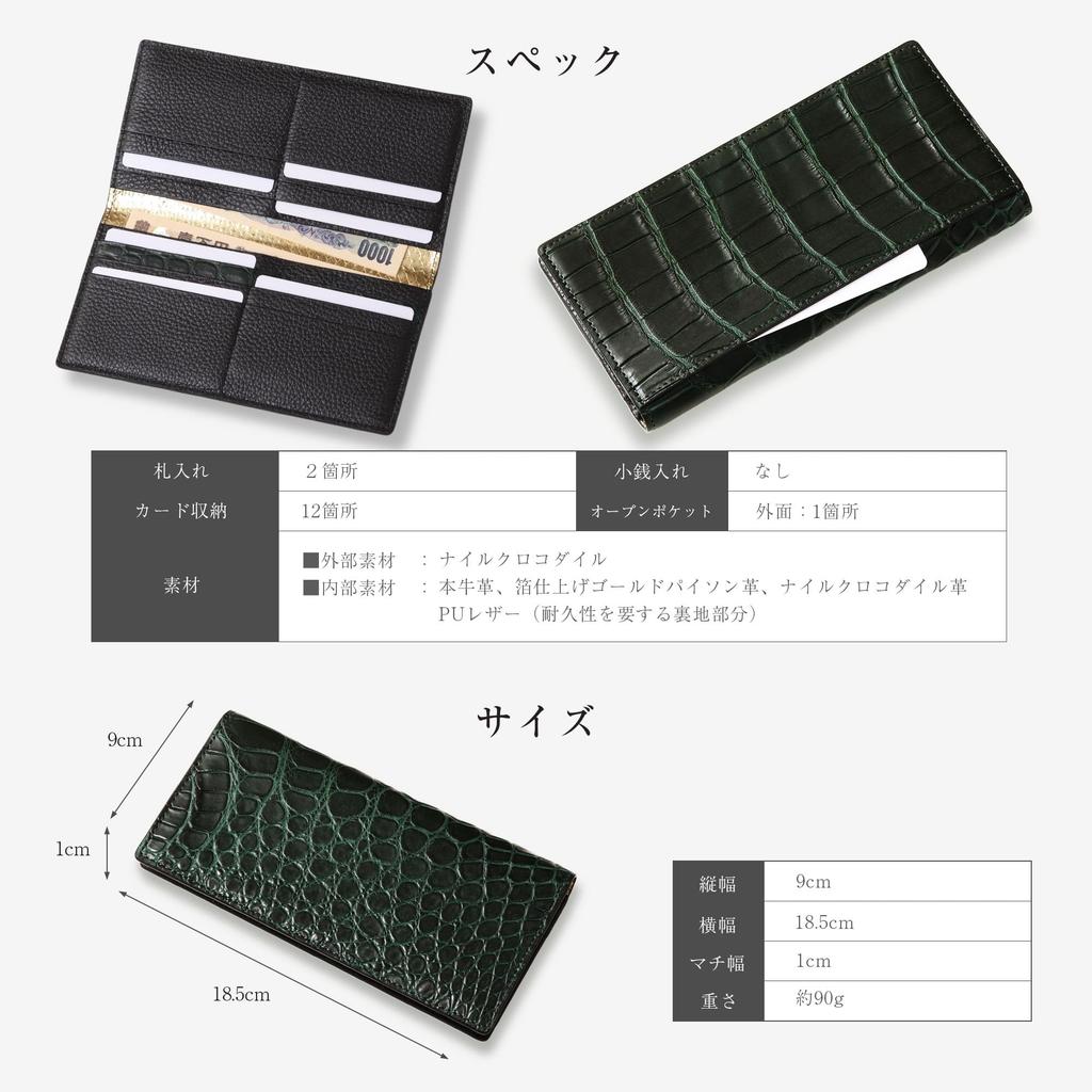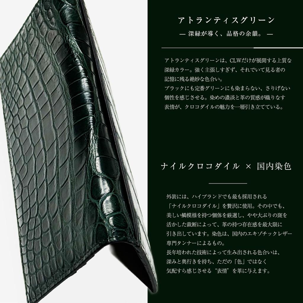 CLW Crocodile Leather Works Thin-Depth Long Wallet (Billfold) in Atlantis Green. Made in Japan. Men's Ultra-Thin Long Wallet with Slim Gusset. A