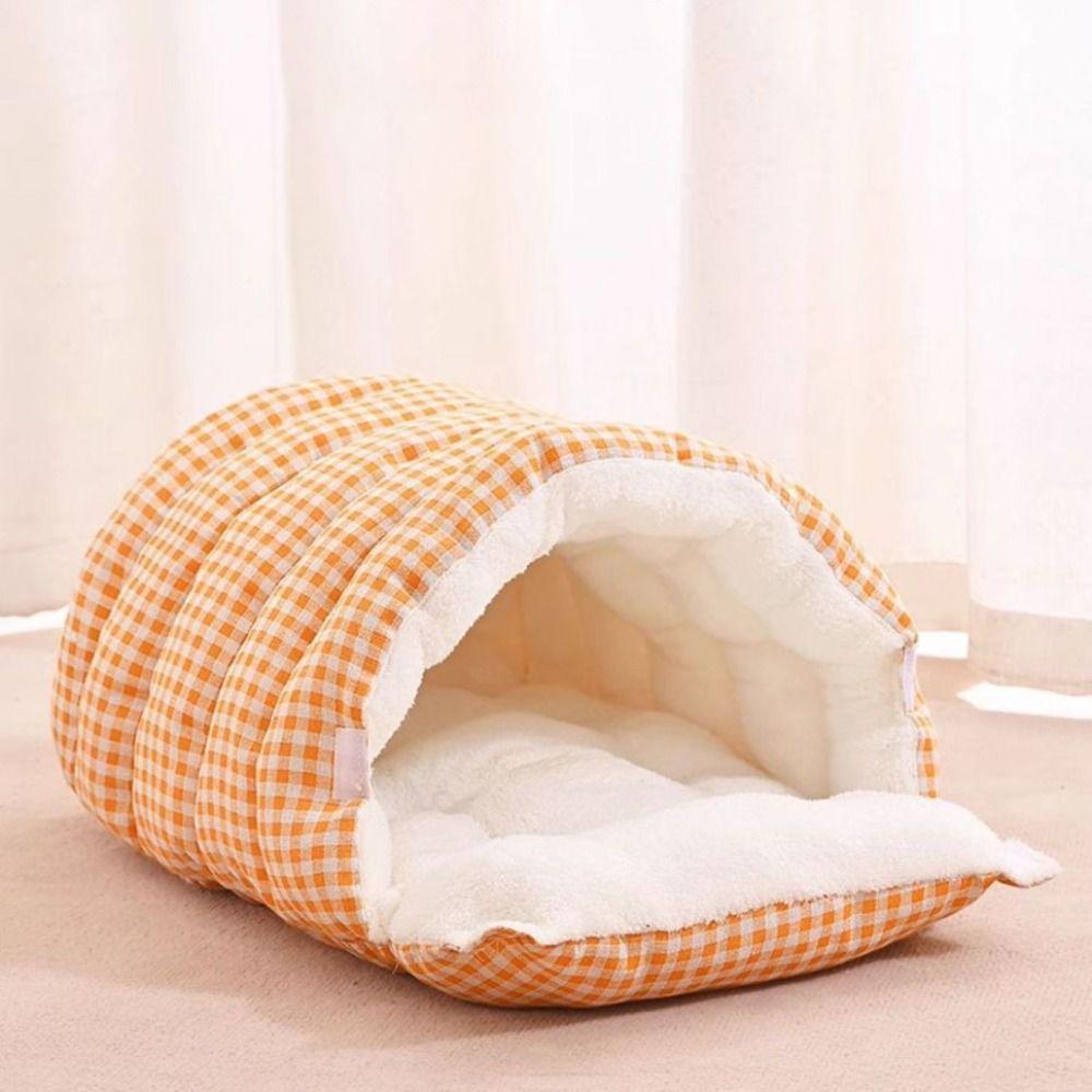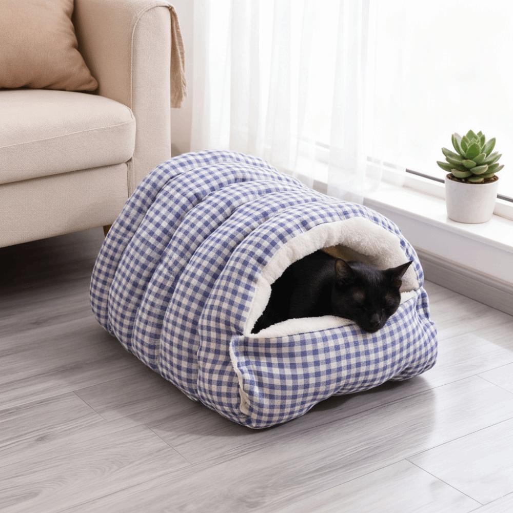 Plush Semi-sealed Pet Bed Checkered Pattern Cat House Cozy Winter Cat Bed Pet Supplies