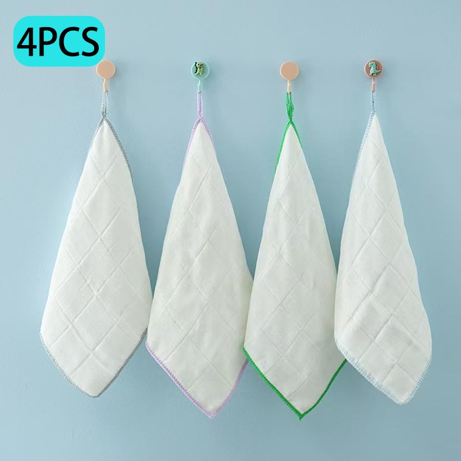 Set of 4 square absorbent cleaning cloths, 30cm square kitchen cleaning towels with colored edges and hanging loops.