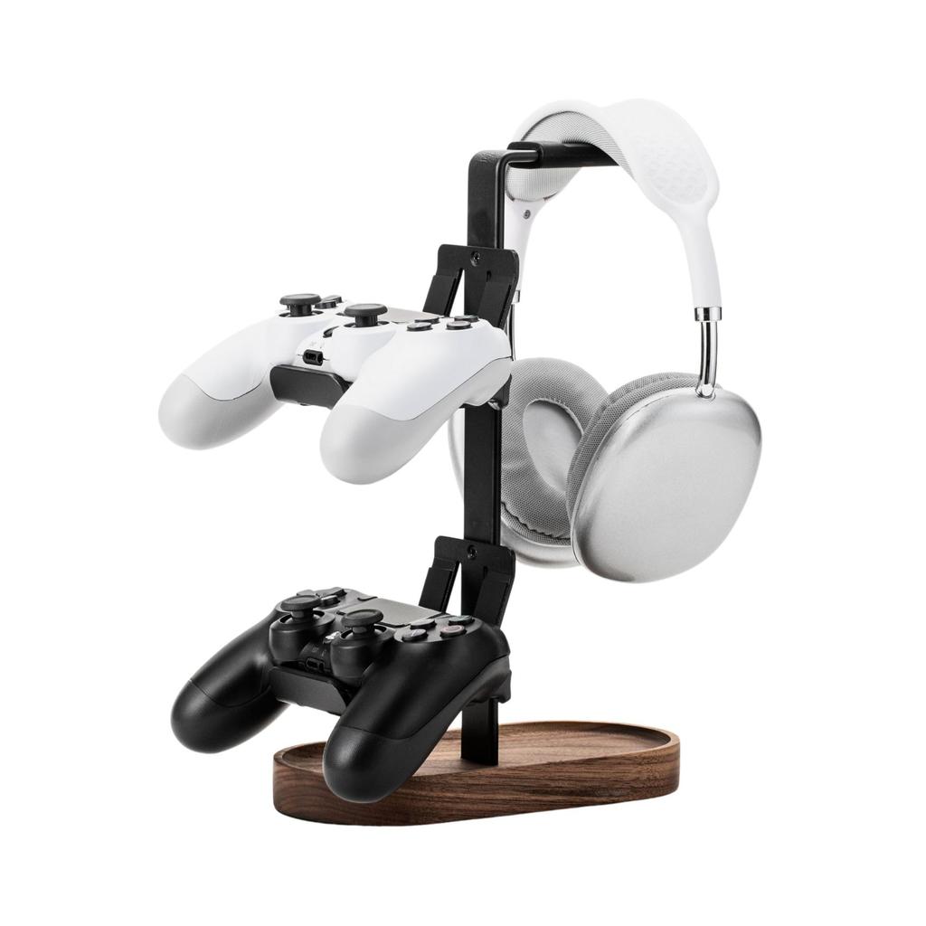 This 2-in-1 desktop stand's compact design allows you to organize your gaming peripherals and headphones, while the base acts as a space-saving tray. Crafted from premium North American black walnut and aluminum alloy, it offers durability and a sophisticated feel. The silicone pad and non-slip rubber base provide protection and stability, while the cable loop on the back keeps cords tangled while charging.