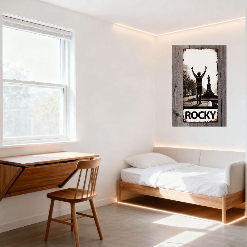 Vintage Metal Tin Sign Rocky Statue Man Cave Bar Home Decor Rustic Weathered Rusted Frame Urban Background Black & White Photo W