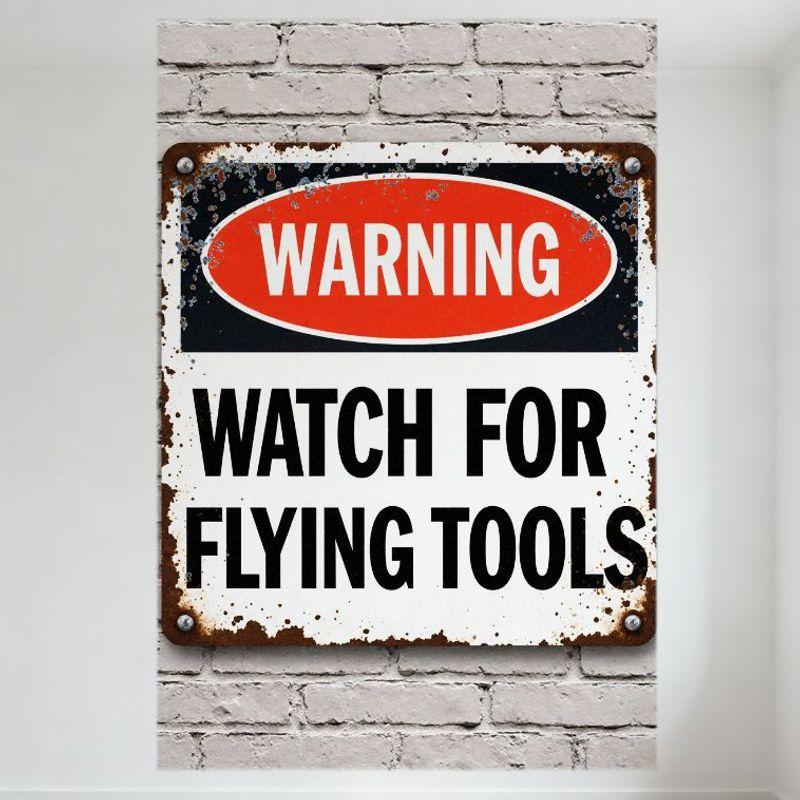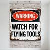 Vintage Weathered Metal Warning Sign with Rust & Chipped Paint - Watch for Flying Tools - Black Oval Border & Red Interior - Hom — купить товар онлайн с бесплатной доставкой по всему миру!