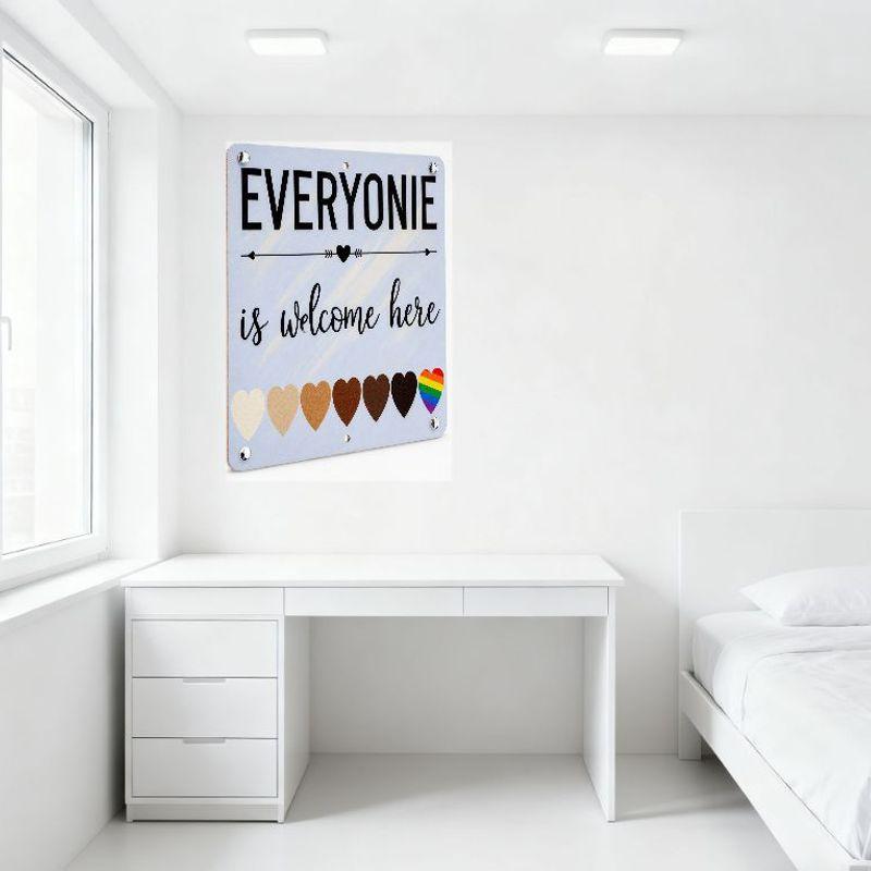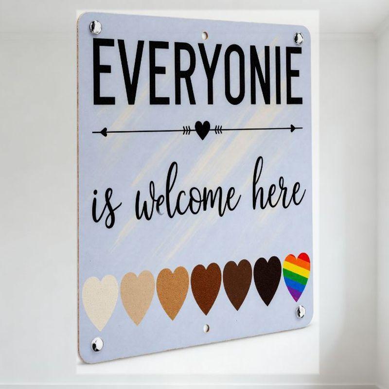 Light Blue Distressed Wooden Sign, 'Everyone (with Stylized E) is Welcome Here' with Hearts & Rainbow LGBTQ+ Pride Symbol, Metal