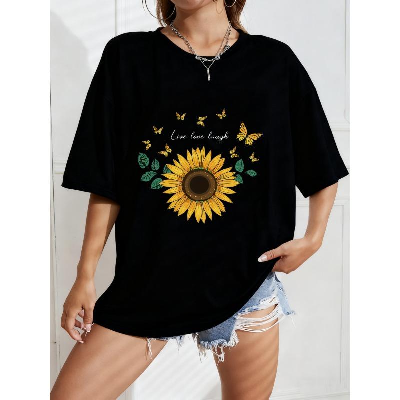 White Sunflower Print T Shirt With Butterflies And Text For Casual Wear — купить товар онлайн с бесплатной доставкой по всему миру!