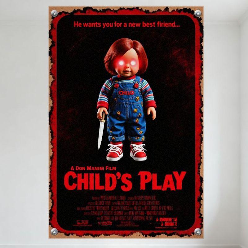 Детская игра Чаки Рыжие волосы Светящиеся глаза Синий комбинезон Подсолнухи Красные кеды Фильм ужасов Металлическая жестяная табличка Ретро декор для стен для
