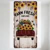 Винтажная металлическая табличка «Свежие подсолнухи с фермы» на фоне деревянных досок, подсолнухи, красный пикап, пчелы - деревенский декор фермерского дома