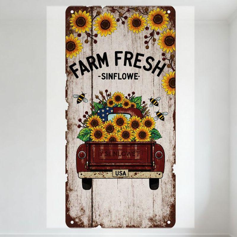 Винтажная металлическая табличка «Свежие подсолнухи с фермы» на фоне деревянных досок, подсолнухи, красный пикап, пчелы - деревенский декор фермерского дома — купить товар онлайн с бесплатной доставкой по всему миру!