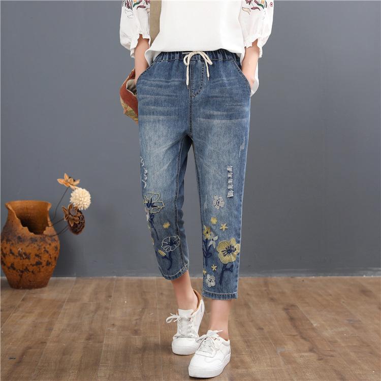 Весенне-осенний модный стиль, женские винтажные джинсы с вышивкой, женские повседневные джинсовые брюки с цветочным принтом, рваные шаровары