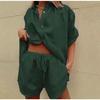 Летний женский модный комплект из двух частей, повседневный свободный топ на пуговицах и шорты на кулиске, однотонный домашний костюм, наряд с коротким рукавом