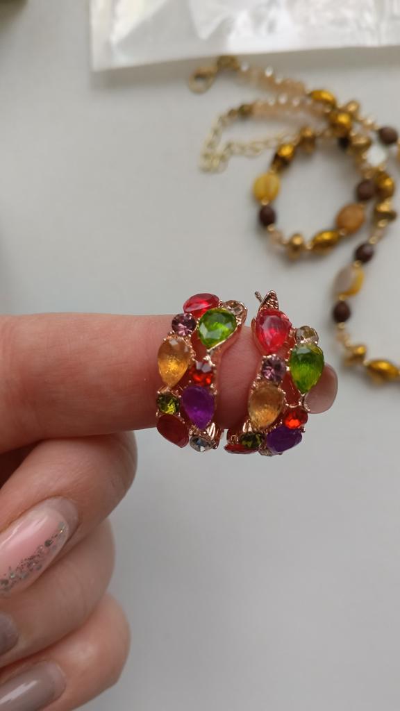 Серьги с разноцветными камушками! Серьги изготовлены из металлического сплава в золотом цвете с яркими камушками. Застёжка хорошая. Серёжки не вызывают аллергии но это конечно индивидуально. ✈️Посылка шла около двух недель до Молдовы, Кишинёв. 📌Посылка была упаковано хорошо. 📌Товар без брака. 📌Дизайн красивый. 📌Качество хорошее. 😍Рекомендую и ещё раз рекомендую к покупке!!!