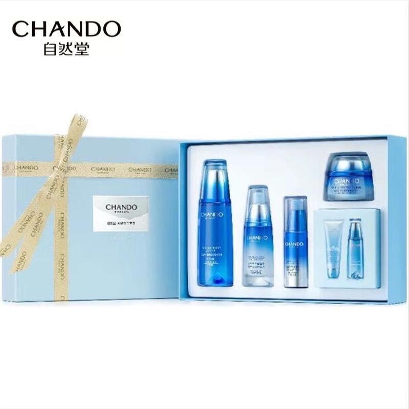 The CHANDO Snow Region Whitening & Hydrating 3-Piece Set provides comprehensive skincare. This set includes Ice Muscle Water (160ml), Face Cream (50g), and Essence (40ml) to brighten and moisturize your skin.