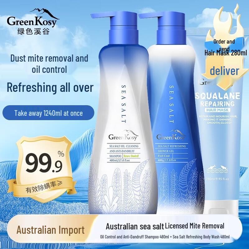 This Green Valley Sea Salt set includes an oil-control anti-dandruff shampoo, a refreshing shower gel, and a nourishing hair mask. Designed for normal hair and combination scalps, the shampoo helps control oil, reduce dandruff, and add volume. The shower gel provides a refreshing cleanse. All products have a 3-year shelf life.