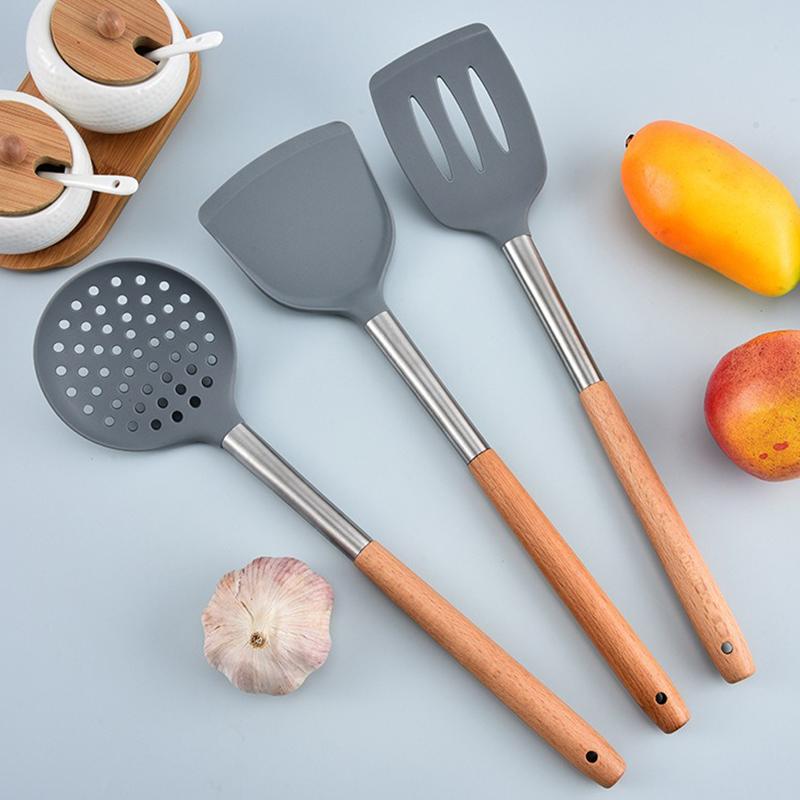 Силиконовая кухонная утварь, деревянная ручка, кастрюля с антипригарным покрытием, кухонные принадлежности, набор для готовки, термостойкая суповая ложка, дуршлаг, лопатка для пасты