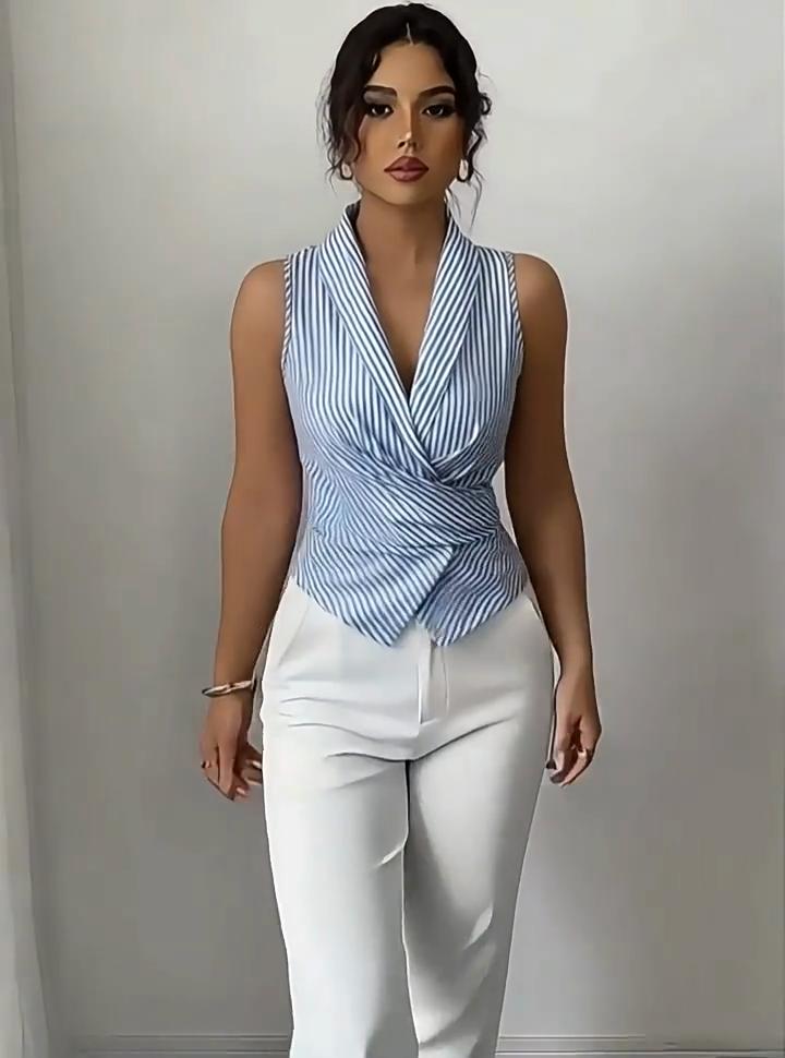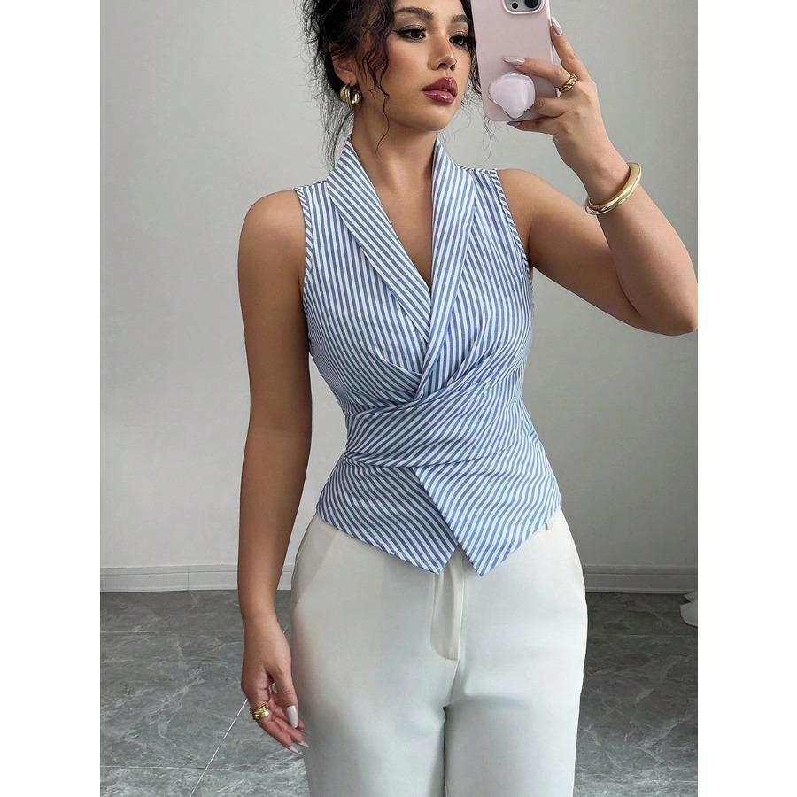 Синяя полосатая майка без рукавов Летняя новая модная повседневная майка на бретелях с завязкой на талии и эффектом похудения Майка без рукавов