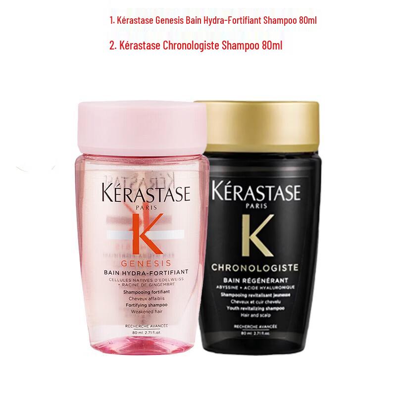 Discover the ultimate hair transformation with the Kérastase Genesis & Chronologiste Shampoo Discovery Set. This duo features an 80ml Genesis Bain Hydra-Fortifiant Shampoo, designed to strengthen weakened hair and reduce hair fall, alongside an 80ml Chronologiste Bain Régénérant Shampoo, which revitalizes the scalp and hair from root to tip. Suitable for normal hair types, this set also provides anti-dandruff and oil control benefits, leaving your hair feeling healthy, balanced, and radiant. Perfect for travel or trying out these iconic Kérastase formulations.