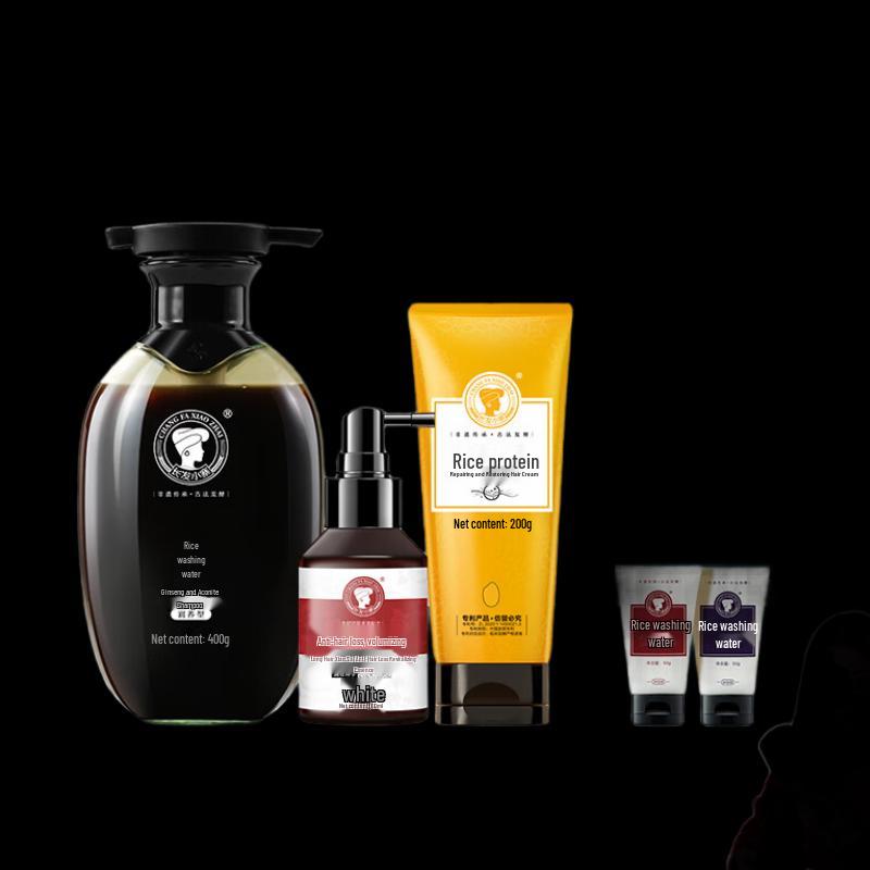 Experience comprehensive hair care with the Long Hair Xiaozhai Anti-Hair Loss & Oil Control Shampoo Set. This all-in-one kit includes a nourishing shampoo formulated with traditional ingredients like Polygonum Multiflorum (He Shou Wu), Ginseng, and Platycladus orientalis, known for their benefits in strengthening hair, controlling oil, and preventing breakage and hair loss. The set also comes with a dedicated hair growth liquid, a moisturizing hair conditioner, and a convenient travel pack, making it suitable for various scalp types and perfect for maintaining healthy, voluminous hair.