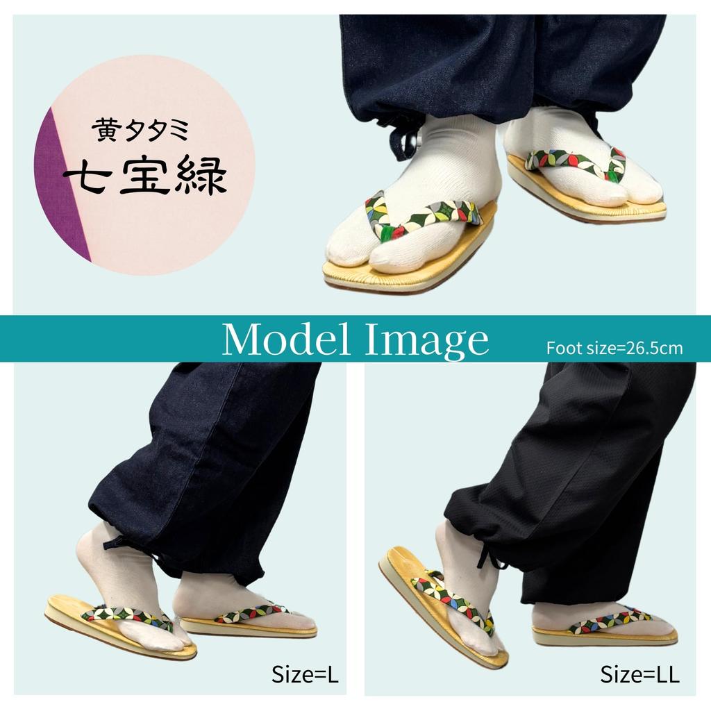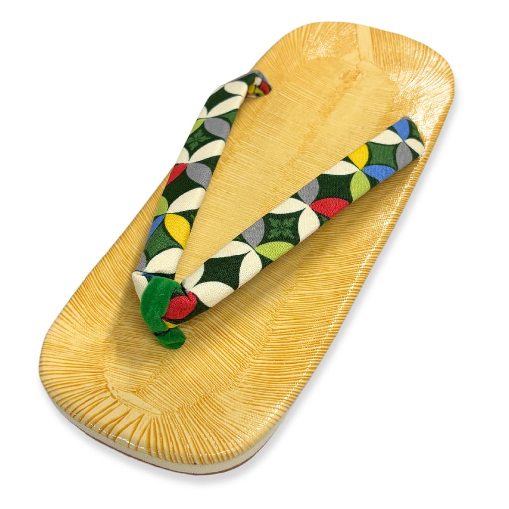 Edoten Geta Sandals, Made in Japan, Yellow Tatami Sole, Patterned Strap, Shippo Green, Size LL