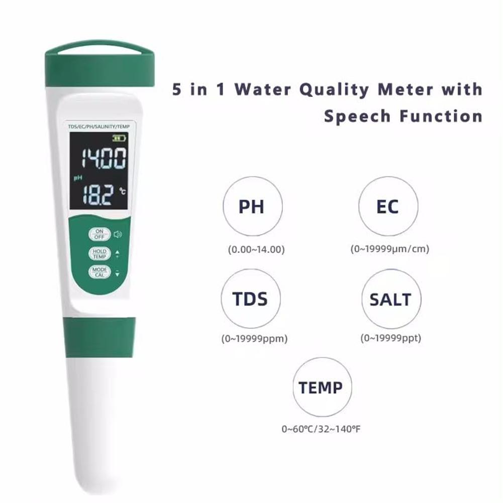 Тестер воды 5-в-1, тестер качества воды, высокоточный цифровой тестер pH, измеритель pH/EC/TDS/соли/температуры для бассейнов, аквариумов