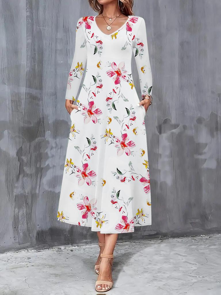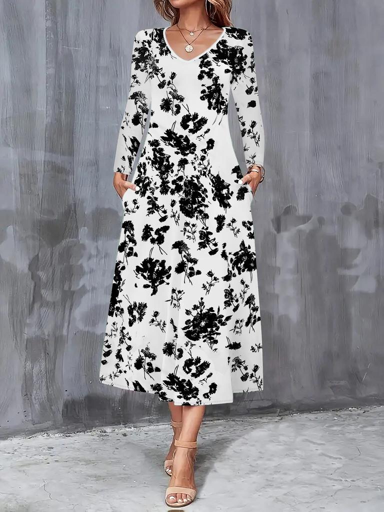 2025 Осень и Зима Новое Женское Повседневное Модное Платье Осень 3D Цветочный Принт Длинный Рукав V-образный вырез А-силуэт Платья