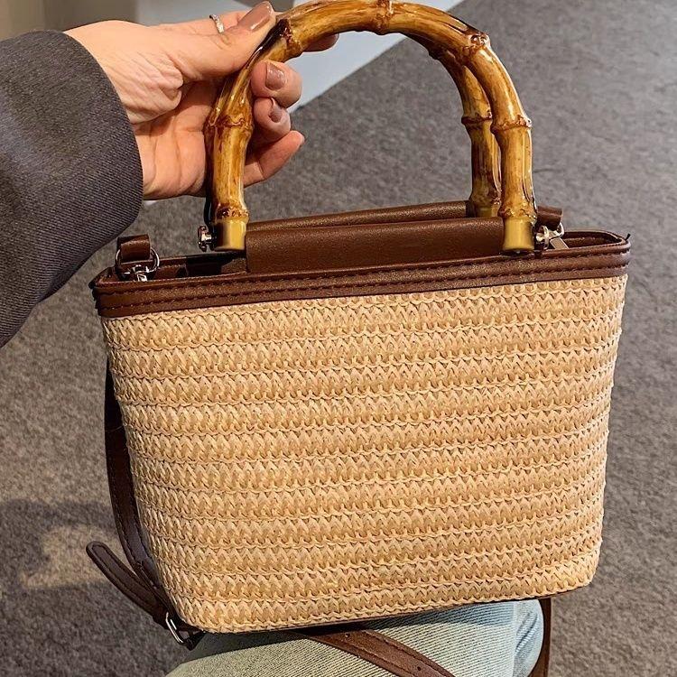 High-End Bamboo Handheld Straw Bag for Women, Niche Versatile Crossbody Woven Bucket Bag, Summer Casual Woven Bag