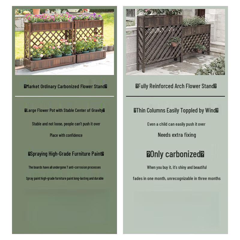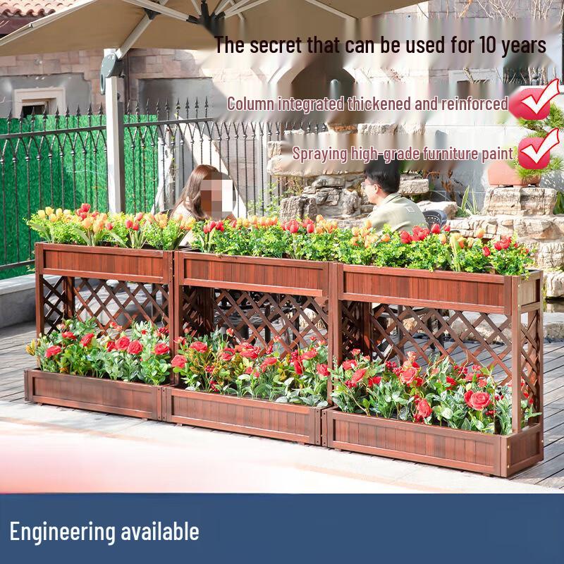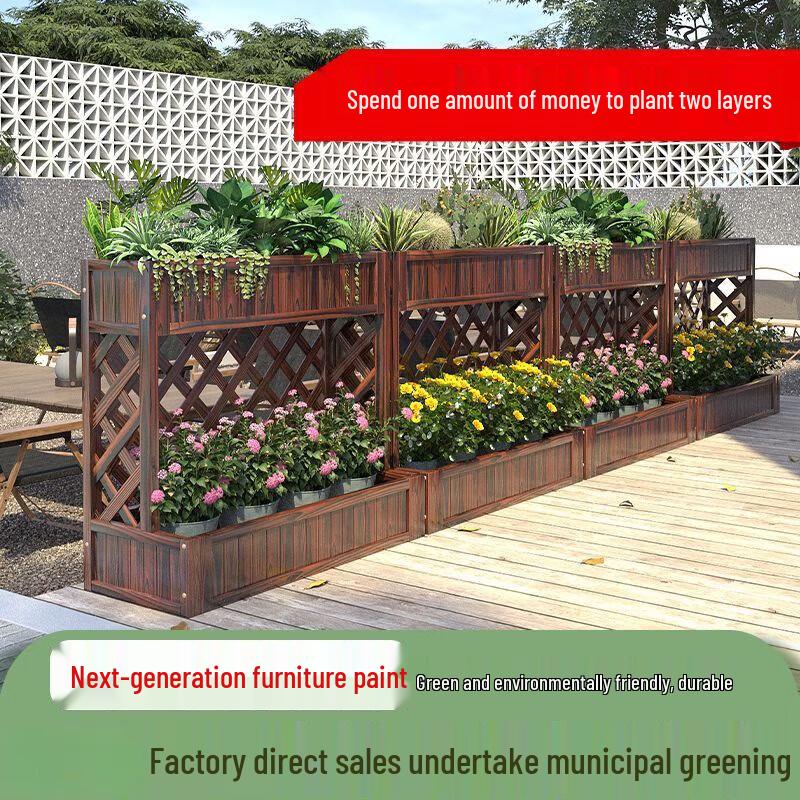 МодельКарбонизированный уличный ящик для растений из массива дерева с решетчатым забором