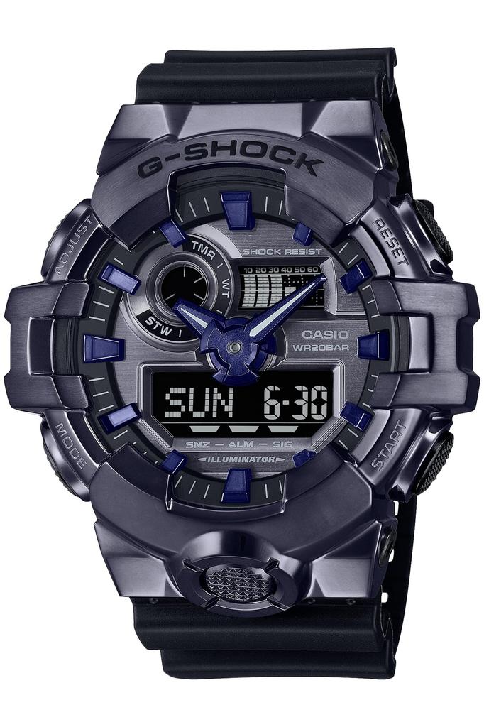 С момента своего запуска в 1983 году G-SHOCK, прочные часы, которые продолжали развиваться в погоне за неустанной прочностью, представили серию GM-700, которая последовала за прочными, но модными моделями GM-5600/GM-6900/GM-110/GM-2100 с безелями из нержавеющей стали.. Базовая модель — GA-700, популярная за рубежом цифрово-аналоговая модель в большом корпусе. Безель из нержавеющей стали доступен в трех цветах: серебристый сохраняет металлическую текстуру, золотистый имеет золотое ионное покрытие, а фиолетовый отличается новым темно-фиолетовым ионным покрытием с фиолетовыми акцентами для шикарного вида.. Легко управляемая передняя кнопка активирует светодиодную подсветку, делая эту модель хорошо видимой даже ночью или в темноте.. Эта популярная модель эволюционировала еще больше, установив новый стандарт для G-SHOCK.