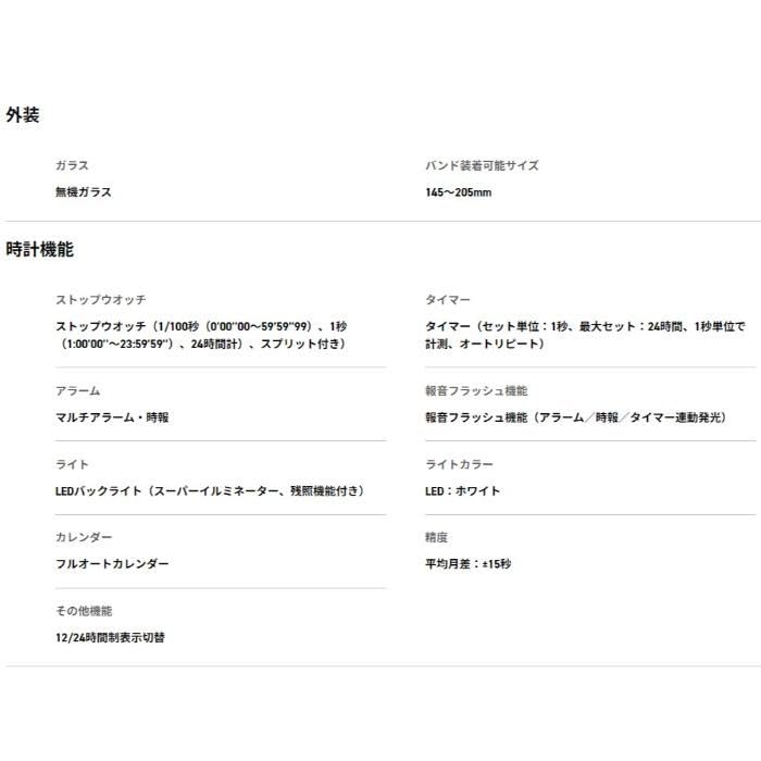 Вес: 53 Материал корпуса и безеля: Смола Смоляной ремешок Ударопрочный (Ударно-стойкий) Водонепроницаемость 200 м Срок службы батареи: Приблизительно 5 лет Минеральное стекло Совместимый ремешок Размер: 145-205мм Секундомер (1/100 секунды (0'00'''00-59'59'''99), 1-секундный (1:00'00''-23:59'59''), 24-часовой счетчик), с раздельным таймером (Установить единицу измерения: 1 секунда, Максимальный набор: 24 часа, Измерение с шагом в 1 секунду, Автоповтор) Многократный будильник и почасовой сигнал Функция подсветки (Взаимоблокировка будильника/почасового сигнала/подсветки таймера) Светодиодная подсветка (Супер-иллюминатор с послесвечением) Светлый цвет: Белый светодиод Полный автоматический календарь Точность: 15 секунд в месяц Переключаемый между 12-часовым и 24-часовым форматами