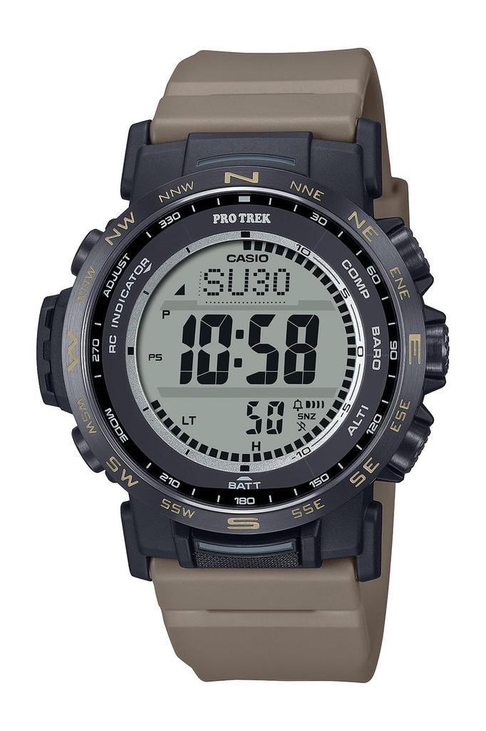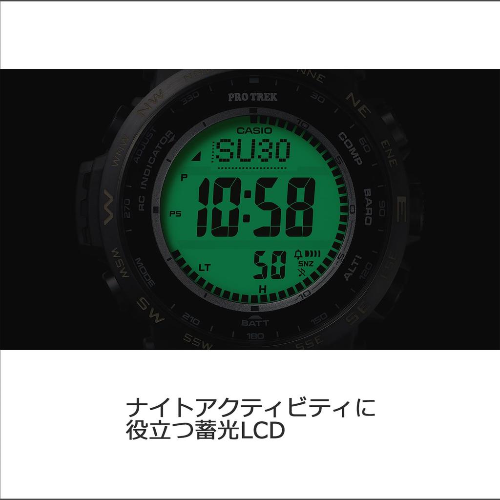 Линия PRO TREK Climber посвящена любителям природы. Корпус, ремешок (PRW-35LD), и задняя крышка из смолы изготовлены из биомассы, что отражает заботу об окружающей среде. PRW-35TLD и PRW-35LD — первые часы Casio, оснащенные люминесцентным ЖК-дисплеем для повышенной практичности во время ночных мероприятий на открытом воздухе.. Светящееся покрытие на нижней стороне цифрового дисплея улучшает видимость в ночное время. При освещении альпинистским налобным фонарем (эквивалентно 200 люменам) примерно с 5 см над часами в течение примерно одной минуты свечение продлится примерно один час. PRW-35TLD оснащены сапфировым стеклом, безелем из нержавеющей стали и титановым браслетом.. Безель и браслет обработаны карбидом титана для устойчивости к царапинам и улучшения сохранения цвета.. PRW-35LD оснащены ремешком цвета темный койот, идеально подходящим для активного отдыха.. С точки зрения функциональности, часы оснащены тройным датчиком, который может измерять компас, высоту/атмосферное давление и температуру.. В дополнение к своим измерительным возможностям, он также предлагает практичные функции, такие как Multiband 6 и Tough Solar.. Эта модель обеспечивает улучшенную видимость в ночное время и обладает высокой функциональностью и практичностью для различных ситуаций, включая кемпинг.. ● Жесткая солнечная энергия (Солнечная система зарядки)