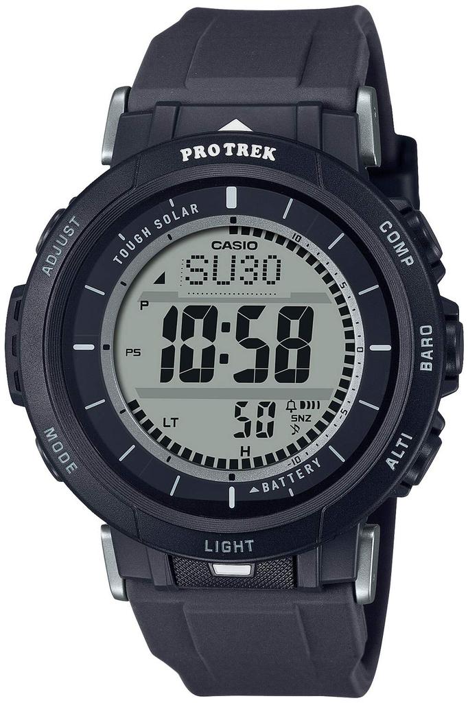 Из линейки аутентичных часов для активного отдыха "PRO TREK" эта цифровая модель обеспечивает удобную посадку для обычных пользователей, таких как туристы и кемперы. Сохраняя практичность тройного датчика и Tough Solar, размер корпуса меньше, чем у предыдущей модели. (ПРГ-330). Разработанный, чтобы быть незаметным даже при длительном ношении, он также легкий. Пластиковая форма безеля предотвращает зацепление за манжеты, а внутренний скос имеет тонко контурированную отделку для острого дизайна.. Блестящие металлические детали на внутренней стороне безеля добавляют текстуры.. Прямая клавиша на правой стороне, поддерживающая измерение тройным датчиком, использует легкие пластиковые кнопки. В дополнение к традиционным защитным выступам кнопок PRO TREK, каждая кнопка имеет отличительную цветную линию с четким, легко читаемым названием функции для предотвращения случайного нажатия.. Передние кнопки в положениях 12 и 6 часов на корпусе выполнены с цветной заливкой. Опорные линии предназначены для облегчения измерения направления по компасу. С акцентом на видимость, ЖК-дисплей использует более жирный, более разборчивый шрифт, чем предыдущие модели, улучшая читаемость отображения времени и различных функциональных дисплеев даже при включенной подсветке.. Часы оснащены силиконовым ремешком DuraSoft, который является гибким и удобным в носке даже при длительном использовании.. Система сменных ремешков позволяет менять ремешок самостоятельно, а такие крепления, как карабины, также доступны отдельно.. Технология Tough Solar устраняет необходимость в регулярной замене батареи, обеспечивая стабильную работу различных функций, включая тройной датчик, который реагирует на изменения в природе, а также обеспечивает практичность.