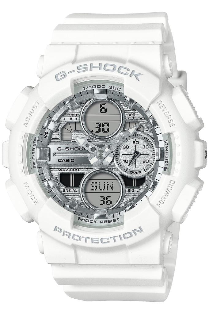 Эта модель в стиле пляжного курорта от G-SHOCK, прочных часов, которые продолжают развиваться в своем неустанном стремлении к прочности. Базовые модели — это GMA-S120, GMA-S140 и GMA-P2100, которые являются миниатюрными версиями популярных комбинированных цифро-аналоговых моделей.. Хотя часы выполнены в едином белом тоне, циферблат и индексные метки покрыты серебряным напылением, что придает им ослепительный и гламурный вид.. Серебристая металлическая отделка делает его идеальным дополнением к серебряным аксессуарам.. Ремешок также изготовлен из экологически чистого биомассового пластика. Эта серия идеально подходит для сочетания со свежей летней модой пляжного курорта.
