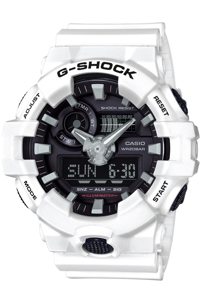 От G-SHOCK, постоянно развивающегося часового бренда, стремящегося к прочности, выходит новая цветовая гамма для аналогово-цифровой комбинированной модели GA-700. Оснащенные объемными часовой и минутной стрелками и смелыми индексами, созданными с использованием уникальной технологии литья смолы G-SHOCK, GA-700, новая стандартная модель G-SHOCK, теперь выпускается в двух новых цветах.: синий и белый. Эти цвета дополняют такие основы уличной моды, как свитшоты и худи.. Эти цвета, соответствующие новому стандарту, расширят возможности повседневного стиля.. (Этот товар - белые GA-700-7AJF.)