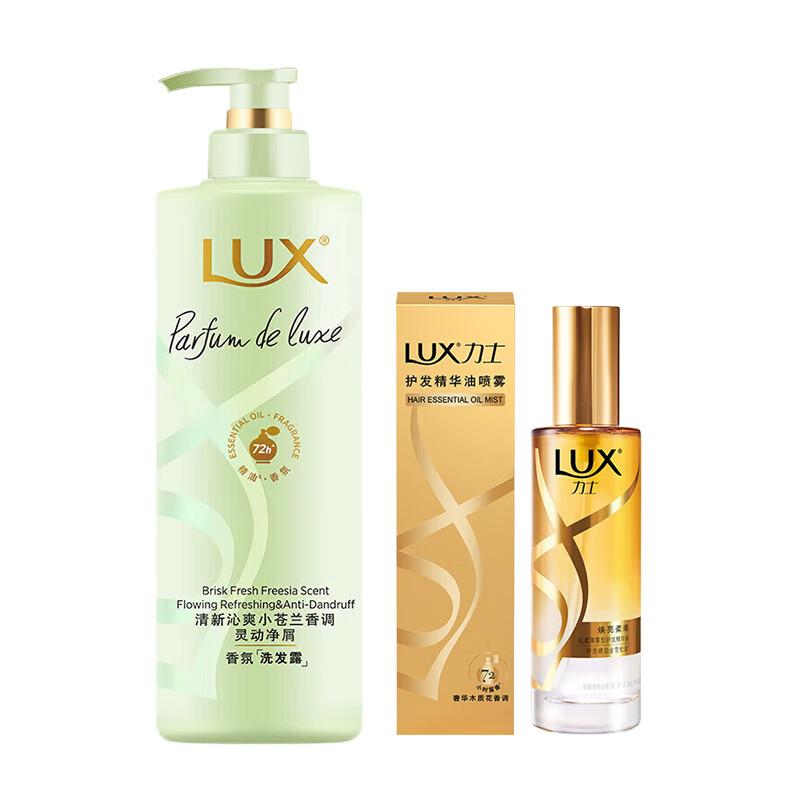 Experience the luxurious fragrance of freesia with the LUX Essential Oil Shampoo. This set includes a 470g shampoo and a 30ml light mist brightening & smoothing hair essence oil. Formulated with essential oils and hyaluronic acid, it helps control oil, adds volume, and leaves your hair with a delightful, lasting fragrance. Suitable for normal hair and various scalp types.