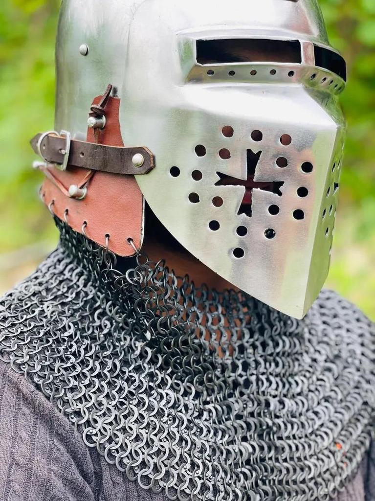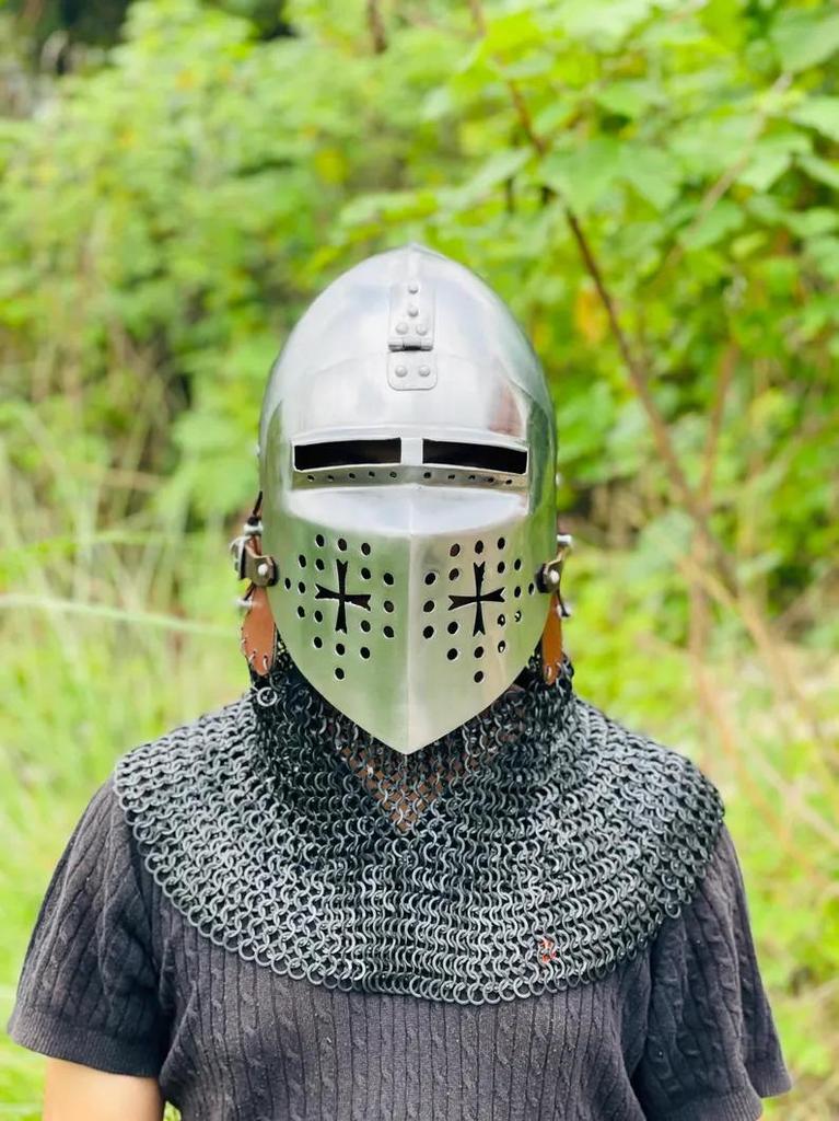 What sets this helmet apart is the meticulously riveted chainmail coif that drapes from the bottom, offering additional neck and shoulder protection. The riveted chainmail is made from durable steel rings, carefully crafted to form a sturdy yet flexible barrier, making this helmet not only a striking visual piece but also a functional one.