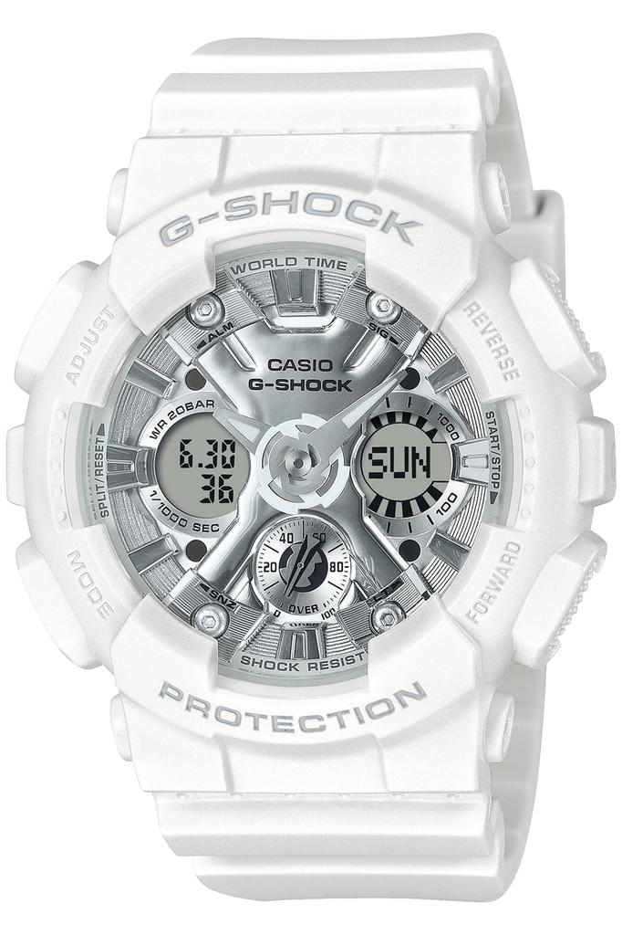 Эта модель в стиле пляжного курорта от G-SHOCK, прочных часов, которые продолжают развиваться в своем неустанном стремлении к прочности. Базовые модели — это GMA-S120, GMA-S140 и GMA-P2100, которые являются миниатюрными версиями популярных комбинированных цифро-аналоговых моделей.. Хотя часы выполнены в едином белом тоне, циферблат и индексные метки покрыты серебряным напылением, что придает им ослепительный и гламурный вид.. Серебристая металлическая отделка делает его идеальным дополнением к серебряным аксессуарам.. Ремешок также изготовлен из экологически чистого биомассового пластика. Эта серия идеально подходит для сочетания со свежей летней модой пляжного курорта.