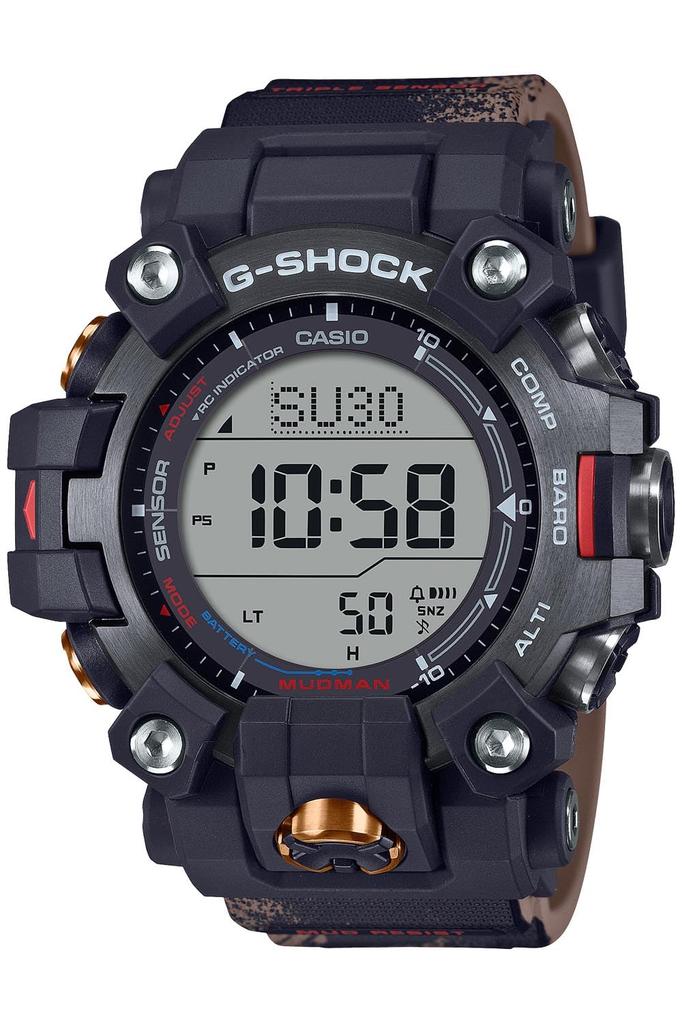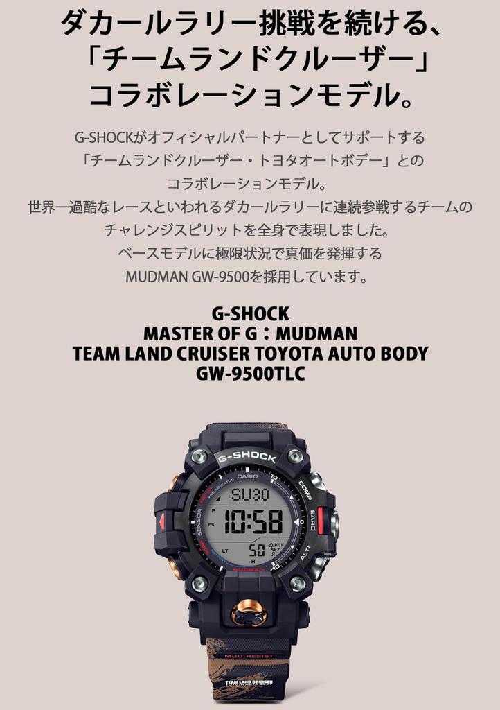 This "Team Land Cruiser Toyota Auto Body Collaboration Model" is a collaboration between Toyota Auto Body, a company that continues to compete in the Dakar Rally, known as the world's most grueling rally, and G-SHOCK, a company that continues to evolve in pursuit of toughness. The design is based on the "MUDMAN (GW-9500)," which boasts a dust- and mud-resistant construction, a dual-layer LCD screen, and a downsized carbon core guard structure. Inspired by a vehicle's powerful performance in the desert, the sand-colored band features a black all-over print of a tireless tire rut design. For the first time, the GW-9500 features stainless steel bezel parts. A black IP coating creates a bold design, evoking a powerful and luxurious feel. The large dual-layer LCD compass function assists with emergency navigation, while the radio wave reception function provides accurate timekeeping, providing immediate support for the team as they compete in the harshest conditions. The team colors of blue, white, and red are used as accent colors, and the team logo is featured on the band and case back. The team logo also appears when the lights are turned on, adding to the special features unique to this collaboration model.