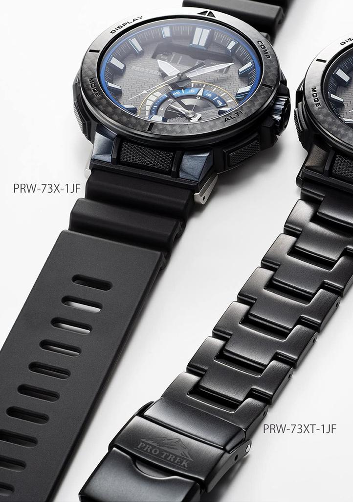 Из линейки PRO TREK Angler профессионального снаряжения для активного отдыха, отличающейся водонепроницаемостью до 20 атмосфер, выходит модель PRW-73 с безелем из углеродного волокна, вдохновленным рыболовными инструментами.. Рифленый ламинированный безель из углеволокна, вдохновленный углепластиковыми удочками, легкий и износостойкий, выдерживает суровые условия рыбалки, где часто возникает трение от манжет.. Циферблат также имеет игривый дизайн с прозрачным печатным узором, напоминающим волны.. PRW-73X имеет высококачественную синюю отделку, вдохновленную спиннинговыми катушками, полученную методом вакуумного напыления на внешней периферии устойчивого к царапинам высокопрозрачного сапфирового стекла.. Безель и заводная головка имеют синее ионное покрытие, а ретроградный циферблат акцентирован металлизированной синей отделкой для смелого, брутального вида.. Глубокий волнистый ремешок использует мягкий уретан, чтобы предотвратить прилипание к запястью, обеспечивая удобную посадку даже вблизи воды.. PRW-73XT оснащены легким, устойчивым к ржавчине титановым браслетом.. Высококачественный ремешок с черным IP-покрытием сочетается с тройной застежкой для предотвращения случайных падений вблизи воды.. Обе модели также совместимы со слайд-рычагами, что позволяет легко заменять ремешок и выполнять другое техническое обслуживание.. Кристалл изготовлен из устойчивого к царапинам, высокопрозрачного сапфирового стекла, сочетающего долговечность с превосходной читаемостью.. Основные функции часов включают Multiband 6, который принимает радиосигналы от шести станций по всему миру, и Tough Solar. Эта модель сочетает в себе высокую функциональность и практичность и имеет идеальный размер для различных случаев.