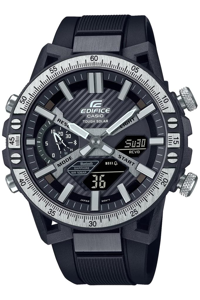 Из семейства высокопроизводительных автоспортивных часов EDIFICE мы представляем «EDIFICE Mechanic Tool Design ECB-2000YTP», который передает солидность и прочность прецизионных инструментов.. Дизайнерский мотив вдохновлен высокоточными инструментами, необходимыми для гонок и автомобильной жизни.. Прочный безель полностью обработан черным IP-покрытием, при этом верхний слой покрытия удален полировкой, что создает черно-серебристую отделку, выражающую ощущение чистого металла.. Смелый, но точный дизайн, включая сложные насечки и накатку, подчеркивает прочность и точность, характерные для профессиональных инструментов, а также его высококачественное исполнение.. Базовая модель — EDIFICE SOSPENSIONE ECB-2000, дизайн которой был вдохновлен подвеской на двойных поперечных рычагах.. Подключение к приложению для смартфона через Bluetooth® обеспечивает автоматическую корректировку времени для точного отображения времени, мировое время с легким выбором примерно 300 городов, передачу данных измерений секундомера с точностью до 1/1000 секунды на смартфон и функцию поиска телефона, которая заставляет смартфон звонить при длительном нажатии кнопки часов.. Эта модель с сапфировым стеклом оснащена технологией Tough Solar, которая генерирует энергию даже от слабых источников света, таких как люминесцентные лампы.