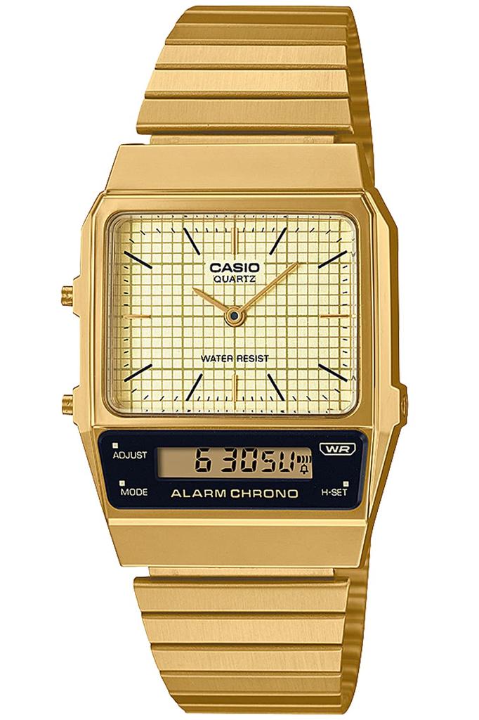 Эта новая модель, вдохновленная выпущенными в 1980-х годах AQ-450, сочетает в себе ретро и стильные элементы.. Циферблат и ЖК-дисплей разработаны независимо, сочетая красоту аналогового с функциональностью цифрового. Аналоговый циферблат имеет простые штриховые метки и часовую и минутную стрелки.. Клетчатый узор на циферблате добавляет ретро-нотку. ЖК-дисплей имеет стильно скошенный верх. Прямоугольный корпус и горизонтально вытянутый металлический браслет создают яркий, стильный вид. Он также оснащен удобными функциями для повседневного использования, такими как секундомер, будильник и двойное время.. Эти часы легко сочетаются с любым нарядом, будь то на работе или в свободное время.