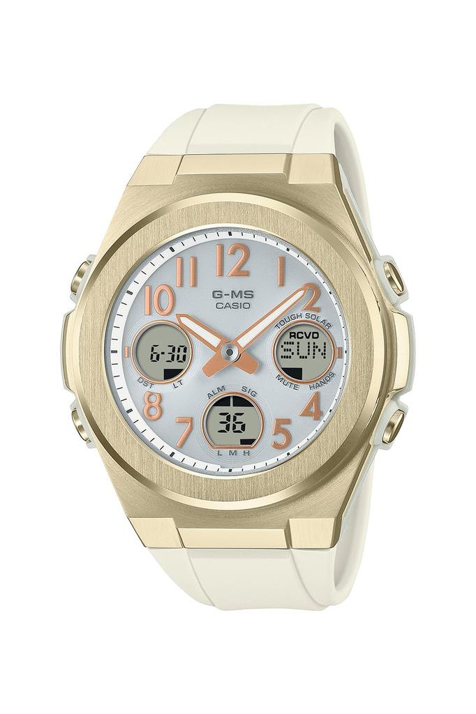 БЭБИ-Г Г-МС (G-Mission) предназначен для активной и изысканной женщины. Эта модель отличается хорошо читаемыми арабскими цифрами и элегантной, удобной в носке цветовой гаммой с нюансами.. Базовая модель — радиоуправляемые часы с солнечной батареей MSG-W610. Эта аналогово-цифровая комбинированная модель оснащена часовой и минутной стрелками и цифровым окном, а также широким, легко читаемым дизайном циферблата.. Два новых добавленных цвета — это безель из светло-желтого золота с кремовым ремешком и серебристый безель с приглушенно-розовым ремешком.. Эта базовая цветовая гамма на круглый год была дополнительно расширена. Основные полимерные детали изготовлены из возобновляемых органических ресурсов, и используется биомассовый пластик, который, как ожидается, внесет вклад в снижение воздействия на окружающую среду путем сокращения выбросов CO2.. С точки зрения функциональности, он оснащен надежными функциями, такими как Multiband 6, которая принимает радиоволны от шести станций по всему миру и автоматически корректирует время, мировое время и Tough Solar. Эти часы G-MS сохраняют функции, полезные в активных сценах, и полезны как для работы, так и для отдыха.