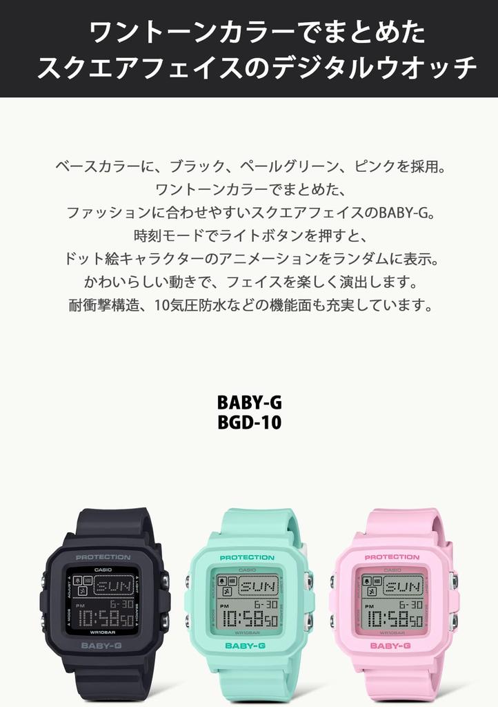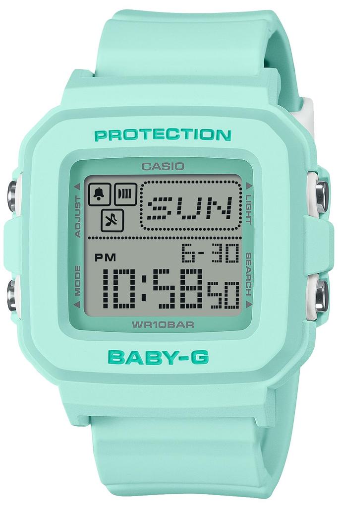 Эти цифровые часы с квадратным циферблатом от BABY-G, повседневные часы для активных женщин, доступны в базовом черном, бледно-зеленом и розовом цветах.. Однотонный дизайн легко сочетается с разнообразной одеждой. Нажатие кнопки подсветки в режиме времени отображает случайную анимацию пиксельных персонажей. (граница, танцор, дельфин, рыба-иглобрюх, собака и кошка). Очаровательные движения добавляют забавный штрих к циферблату часов.. Он также обладает рядом характеристик, включая ударопрочность и водонепроницаемость до 10 бар.